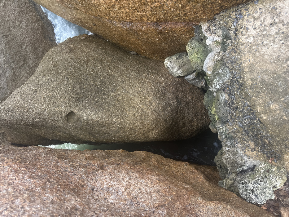 Large boulders of varying textures and colors form a natural enclosure. Water, barely visible, flows between the rocks. One boulder, smooth and gray, has a small, almost heart-shaped indentation. The rightmost boulder has a rough, layered surface, and a greenish hue suggesting moss or algae growth. The top boulder is a warm brown, while the bottom one is reddish. The composition emphasizes the interplay of textures and the subtle presence of water amid the rocks.