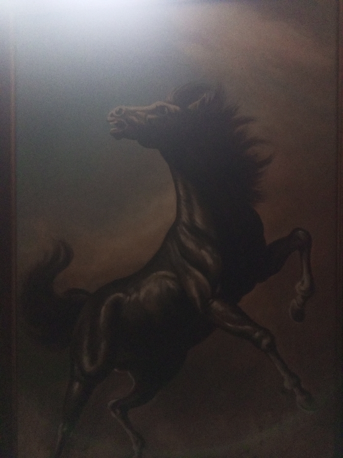 The image is a photograph of a painting depicting a single dark-colored horse rearing on its hind legs