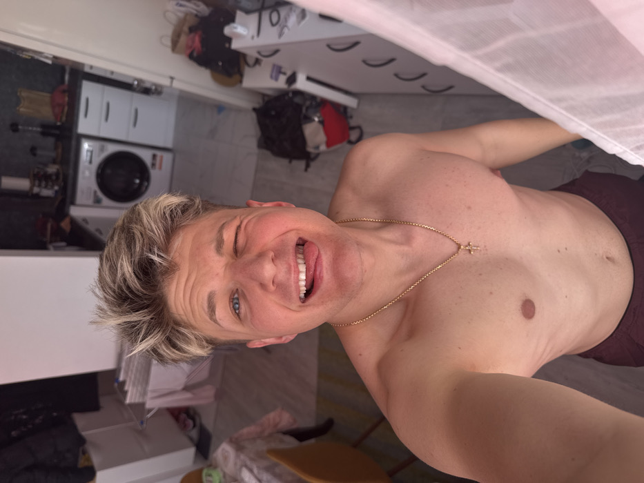 A young adult male, with light skin, blue eyes, and short, spiky blonde and brown hair, is depicted in a selfie. He is shirtless, revealing his upper torso, and wears dark-colored shorts. A thin gold chain with a small gold cross pendant is around his neck. He is smiling, winking his right eye, and extending his tongue. The scene takes place within a domestic interior, consistent with an apartment in Plovdiv, Bulgaria. In the background, to the left, a partial view of a dining table with a tablecloth and a yellow-backed chair is visible, alongside a white collapsible clothes drying rack with laundry and dark clothing suspended above. The central-right background transitions into a kitchen area, featuring a white front-loading washing machine integrated next to white base cabinets with drawers. A countertop above holds various kitchen items, including bottles and a blender. The flooring is light-colored tile. On the immediate right, a white door frame or cabinet, multiple bags containing items, scattered clothing, and a white chest of drawers with curved handles are present. A sheer white curtain hangs along the far right edge of the frame.