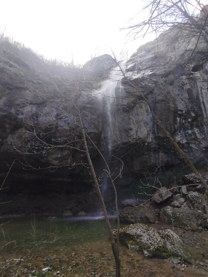 The image displays a natural waterfall within a rugged, rocky landscape near Veselinovo, Bulgaria. A prominent vertical stream of white water descends from a multi-tiered, grey and brown rock cliff face. At the base of the waterfall, a greenish-brown pool collects the water, with ripples visible on its surface. The cliff face exhibits dark, recessed overhangs and textural variations. In the foreground and midground, several slender, leafless deciduous trees stand with their intricate branch patterns partially obscuring the view. The ground surrounding the pool consists of exposed soil, scattered small rocks, and larger boulders, some covered with green moss, particularly on the right side of the frame. The upper portion of the image shows a bright, possibly overcast, sky, and a vegetated hillside is visible on the upper left. No human figures, animals, or artificial structures are present.