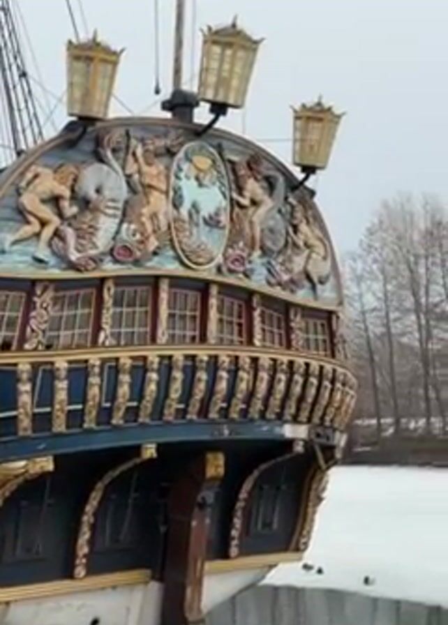 stern of a large, ornate, historic sailing ship docked next to a body of water, partially covered in ice