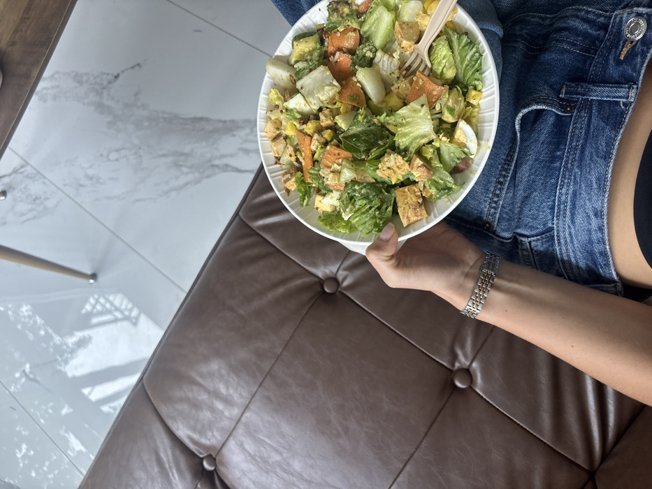 - "A person in blue denim jeans holds a white bowl filled with salad" by FM-mU2BK2, licensed under CC BY 4.0