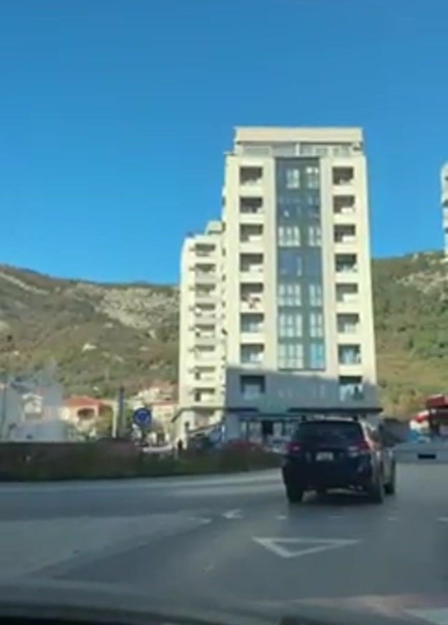 From the perspective of a person in a car, the camera is positioned behind the dashboard and captures a view of the outside world. The sky is a bright blue and a light-colored, multi-story building is visible. A car drives around a roundabout in front of the building. The camera zooms in to show a large teddy bear sitting on the balcony of one of the building's apartments. The base of the building features signage for a store called "Mix". The background features green, tree-covered mountains.