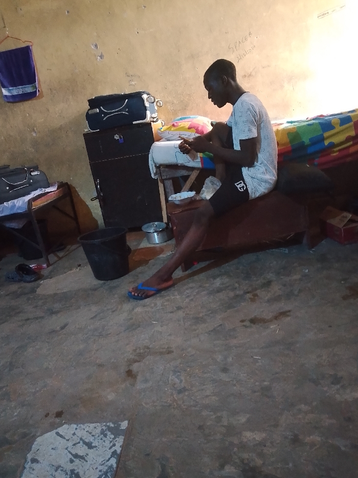 The scene depicts an interior space in Rumuekini, Nigeria. A male individual with dark skin and short hair is seated in profile, facing right, on a brown upholstered surface. He is wearing a white short-sleeved mesh shirt and black shorts with a white "DG" logo on the left thigh. His right foot is bare, while his left foot wears a blue flip-flop. He is looking down and manipulating a small, light-colored rectangular object with both hands. To his left, a small white plate with remnants is visible on a wooden structure. The room features textured, light brown walls, exhibiting wear and discoloration. The words "SPACE B History" are handwritten in white on the upper right wall. A blue towel hangs from a hook on the upper left wall. The floor is concrete, displaying an uneven texture, dirt, and discolored patches. A lighter-colored, roughly rectangular patch is visible on the lower left floor. Objects in the environment include: - A black cabinet or wardrobe with silver handles, topped by a black hardshell suitcase with silver accents, located behind the seated individual. - To the far left, another wooden stand holds a black soft-sided bag. - On the floor, a black bucket with a silver handle is positioned left of the individual. - A small silver pot with a lid rests near the bucket. - A pair of dark-colored slip-on shoes are near the lower left corner of the frame. - A multicolored patterned sheet or blanket (with yellow, blue, and red squares) and a white pillow are visible behind the seated individual. - A red and white cardboard box is partially visible on the far right. The room is illuminated by what appears to be a light source from the upper right, casting a bright highlight on the wall.