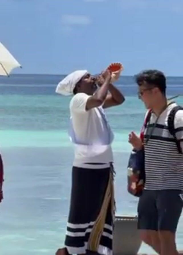 On a sunny pier over crystal turquoise water, a man dressed in a white head wrap, t-shirt, and a sarong with black and white stripes at the bottom, blows a conch shell towards the ocean