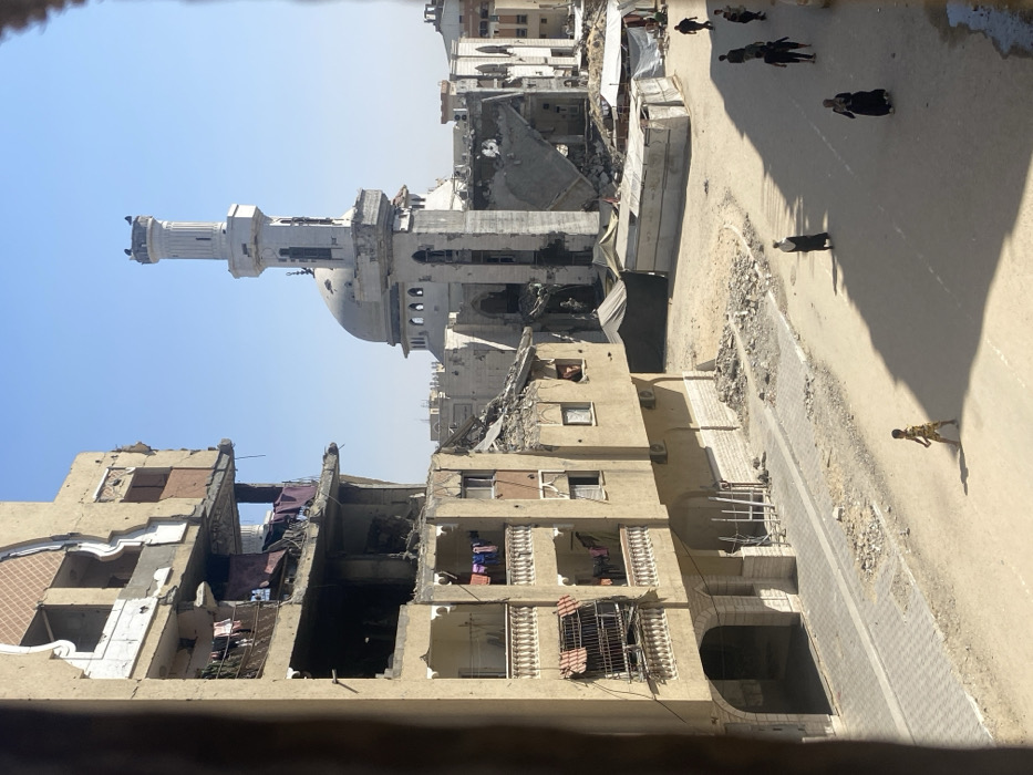 The image captures a street scene in Khan Yunis, Palestinian Territory, exhibiting extensive structural damage under a clear, bright blue sky. In the left foreground, observed from an elevated perspective, stands a multi-story residential building with a beige facade. This building shows significant damage, with collapsed sections, exposed interior rooms on upper floors, and visible reinforcement bars. Laundry, including dark and light fabrics, hangs on clotheslines from at least two balconies equipped with white railings and partial sun shades on the left side of the structure. The midground features an unpaved, dusty street running diagonally from the lower left to the right. A narrow, broken paved sidewalk borders the street on the left. Piles of rubble and debris are scattered along the street and at the base of the damaged buildings. Dominating the background on the right is a heavily damaged white mosque, distinguished by its large central dome and a tall, slender minaret. The minaret exhibits significant damage and has two dark birds perched near its top. The mosque's structure shows large perforations, collapsed sections, and exposed interiors. Surrounding the mosque are further ruins and temporary tent-like structures made of white tarpaulins. Several individuals are present on the street. In the left midground, a lone child in a light-colored, patterned garment walks away from the damaged building, casting a long shadow. Further down the street towards the right, approximately five adults are walking away from the viewer. Some of these individuals, notably two women, are wearing long, dark traditional garments and headscarves. One adult figure is distinct in darker clothing. The light conditions indicate strong direct sunlight.