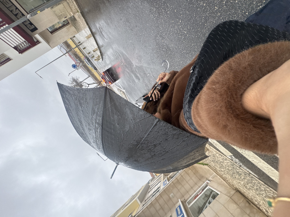 The image depicts an urban street scene in Torres Vedras, Portugal, during a rainy, overcast day. The perspective is a low-angle, first-person view, primarily focusing on a person holding a wet, open black umbrella in the upper-center. Raindrops are visible on the umbrella's surface. The person is wearing a brown, textured, possibly faux-fur, coat and has a black woven handbag slung over their shoulder. A hand with a gold ring featuring a green stone is visible in the lower-left foreground. In the background, a wet asphalt street with white markings is visible. A red vehicle with illuminated taillights is moving away in the mid-ground, creating reflections on the soaked road. Buildings line both sides of the street. On the right, a multi-story, light-colored building features red accents and displays partial signage, including the word "PLANE." On the left, another building, possibly yellow or light-colored, shows partial signage with the word "TECNOO." A street lamp pole and a circular blue road sign are also present in the mid-ground. The sky is uniformly overcast.