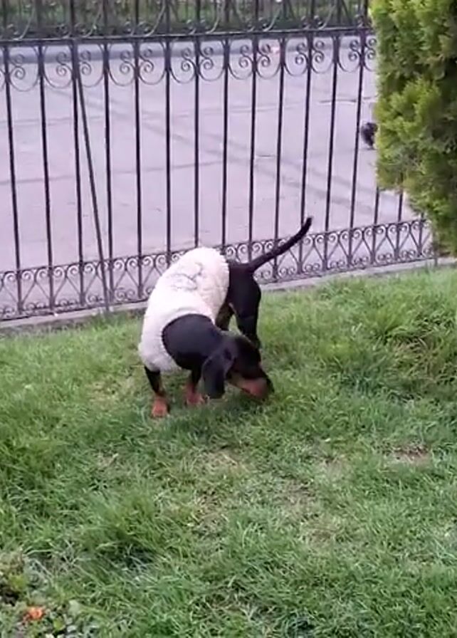A small, black and brown dog wearing a light-colored sweater sniffs the ground in a grassy area. The dog moves from the open grass toward a small evergreen tree, sniffing around the base of the tree. Behind the dog is a dark metal fence. A pole stands to the left, and a partially visible person walks in the background.