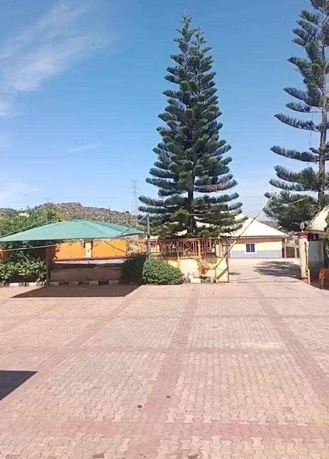 The camera pans across a paved courtyard between buildings and a gazebo, on a sunny day with some clouds in the sky. The courtyard is made of red and gray interlocking paving stones. On the left is an orange building with a green roof, which appears to be a gazebo. In the center are two tall, cone-shaped coniferous trees standing in line. Behind the trees is a gated entrance to another building with a white roof. On the right is a two-story building with a row of windows on the second story.