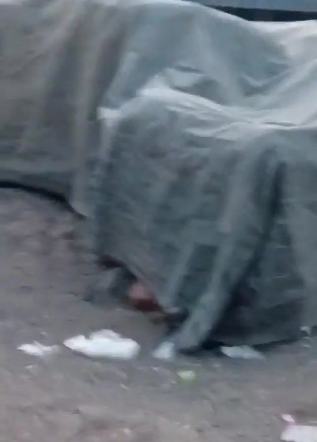 The camera is shaking and focuses on a large truck with a blue and orange cab. The truck is stationary, and its rear wheels are visible. Part of the truck is covered by a tarp, and there is some litter on the ground, including a pink item. The ground appears to be a dusty or dirt-covered surface. The video seems to have been taken at ground level.