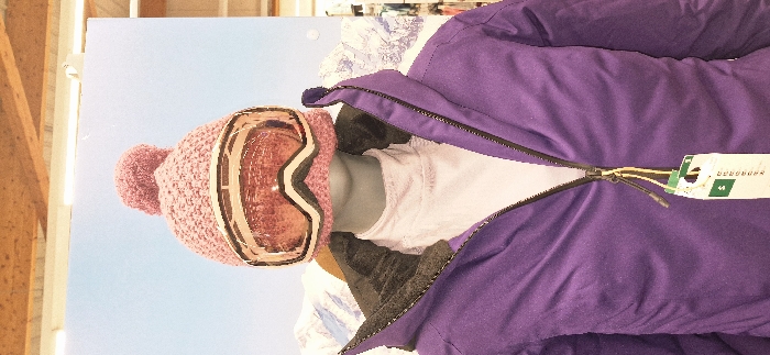 A mannequin head wears a pink beanie with goggles against a backdrop of snow-capped mountains. The mannequin is dressed in a white shirt with a partially zipped purple jacket. A clothing tag hangs from the zipper. The scene is indoors with wooden beams visible in the background. The presentation focuses on winter attire.