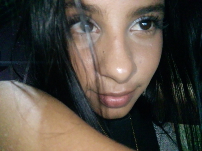 A close-up shot focuses on a young woman's face. Her dark hair frames her face, partially obscuring one eye. She has light skin, dark eyes, and full lips. A thin gold necklace is visible. The background is dark and indistinct. The lighting is soft, highlighting her features and creating subtle shadows. The angle of the shot is slightly low, making her appear as if she is looking down.