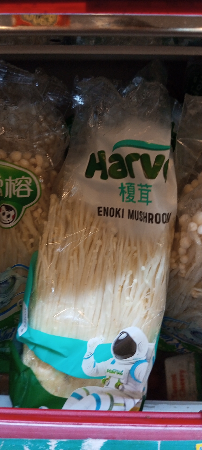 A package of "Harvi" brand enoki mushrooms sits on a shelf, next to other packages of similar mushrooms