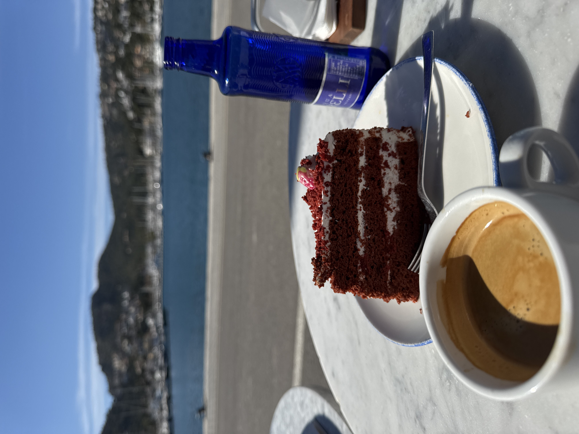 The image depicts a scene at an outdoor table in what is likely the city of Andratx, Spain, as suggested by the coastal view. On the table, which appears to be marble, there is a slice of red velvet cake on a white plate with a blue rim, a fork, a blue glass bottle, and a white coffee mug filled with coffee. In the background, the image shows a coastal view featuring a rocky cliff formation, the ocean, and a clear blue sky. People are visible in the distance on the beach.