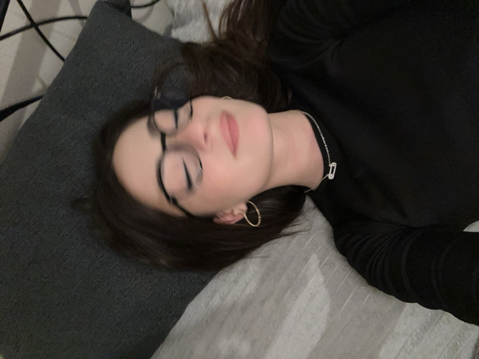 - "A woman with dark hair, wearing glasses, a black top, a silver necklace with a pin pendant, and hoop earrings is lying on a gray pillow or cushion on a bed" by FM-vVQbp1, licensed under CC BY 4.0