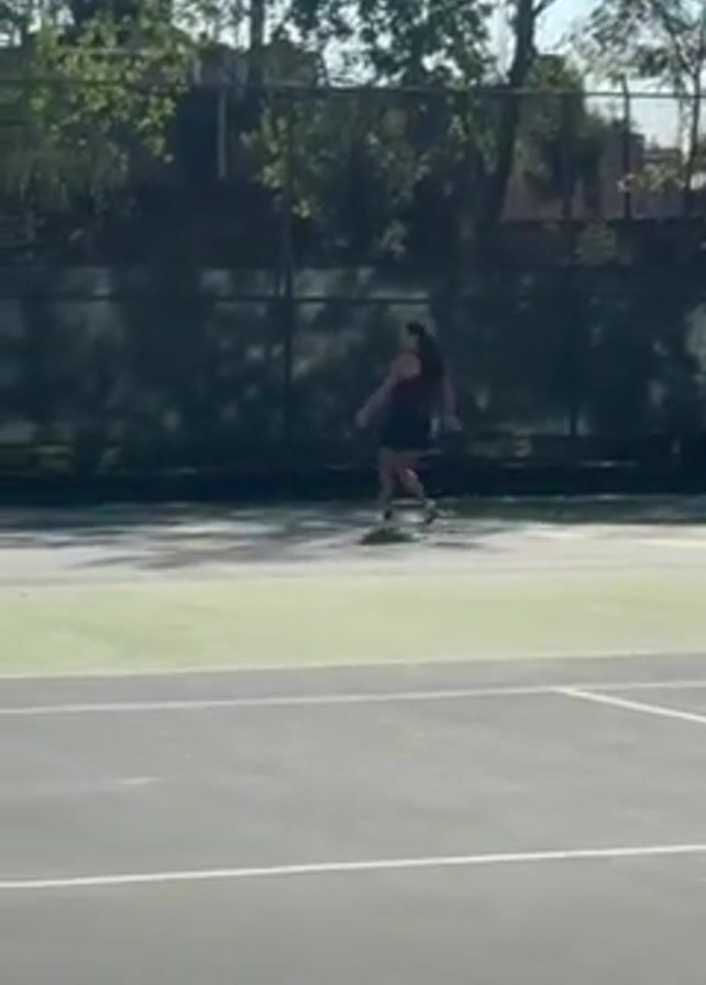 A young woman is playing tennis on an outdoor court. She is wearing a dark colored top and bottom. She swings the tennis racket, presumably hitting a ball that is not visible in the frame. The tennis court is green and gray with white lines. A dark green fence and trees are in the background. The scene is well lit.