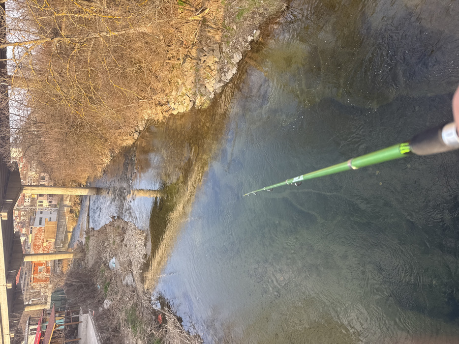 The image depicts a first-person perspective of fishing in a river in Dryanovo, Bulgaria