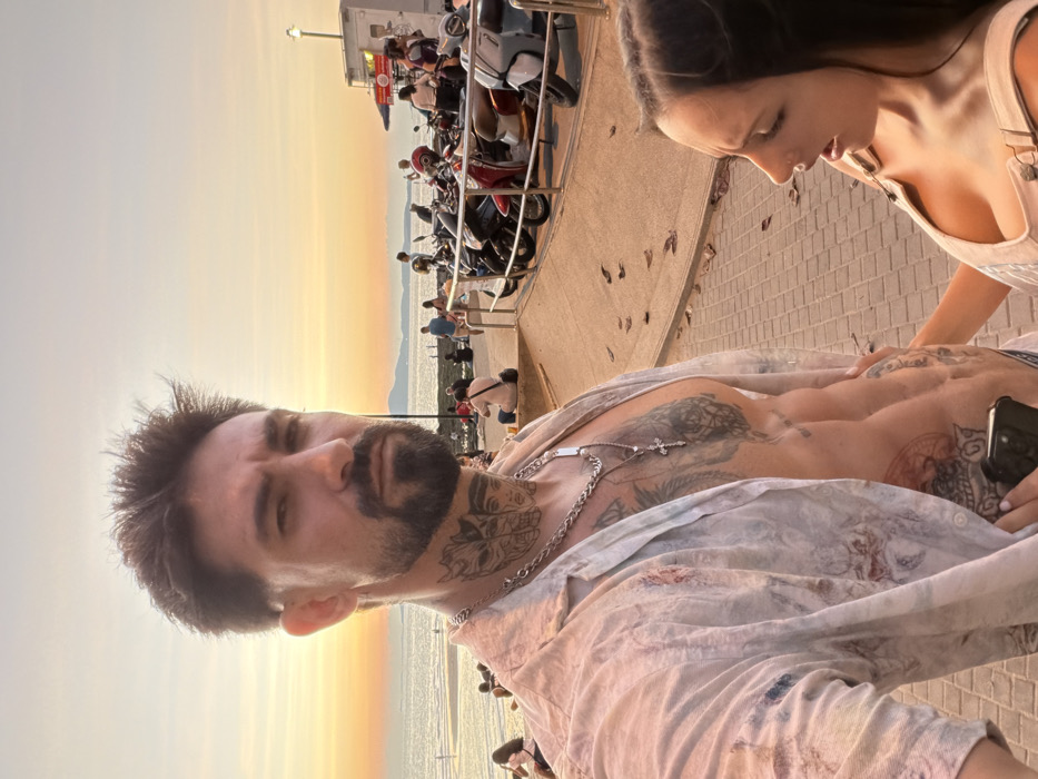 A detailed image captures two individuals in the foreground of a coastal scene during sunset or sunrise, identified as Pattaya City, Thailand. The primary subject, a male, occupies the central left and mid-section of the frame, facing directly towards the viewer with a neutral expression. He possesses dark, styled hair and a full beard and mustache. Prominent tattoos are visible on his neck (stylized faces/masks), chest (abstract designs), and abdomen (various motifs). He wears an open, light-colored, short-sleeved collared shirt with a subtle pattern, revealing a muscular physique with visible abdominal muscles. Two silver chain necklaces are worn; one features a cross pendant, the other a rectangular pendant. His left hand is positioned near his hip. Partially visible in the lower right foreground is a female. She has long dark hair and a light complexion, with a small stud visible in her left nostril. She wears a light-colored, possibly beige or white, overall-style top. Her head is tilted upwards, and her mouth is slightly open, appearing to be in mid-speech or reaction, directed towards the male's lower torso. Her right hand rests on the male's left hip, and she holds a black smartphone. The background, under a warm orange and yellow sky, displays a beach and promenade environment. To the far left, the ocean meets a sandy shore where several indistinct figures are seated or standing. Distant hills or landmasses are visible on the horizon across the water. A paved promenade, constructed from light-colored rectangular pavers, stretches across the mid-ground. Along the right side of the promenade, a low metal barrier separates it from a row of parked scooters and motorcycles of various colors (red, white, gray, black). Further right and in the background, a white food truck or stall with an awning is present, surrounded by multiple people. A streetlight pole stands near the food stall. The lighting suggests "golden hour," with warm, soft illumination across the scene.