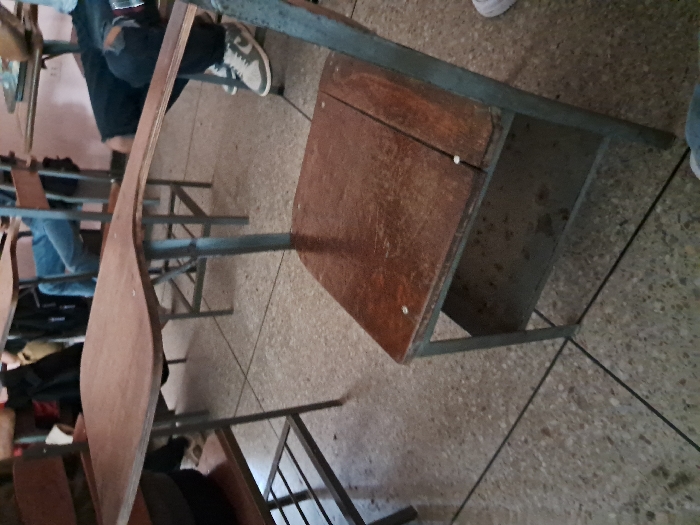 The image depicts an indoor scene within a classroom or educational facility in the city of Las Piedras, Venezuela. In the foreground, a vintage-style, combined student desk-chair unit is prominently featured. The desk component is a curved, worn wooden surface, attached to a faded blue-grey metal frame. The chair features a worn wooden seat with visible fastening screws, and a metal storage shelf is present beneath the seat. The unit appears unoccupied. The floor consists of light grey, speckled tiles with dark grout lines. In the mid-ground and background, several other similar desk-chair units are visible. Occupying some of these units are individuals, with their lower extremities partially visible. One individual to the right wears ripped dark blue jeans and light-colored sneakers. Another individual to the left is partially seen from the back, wearing dark attire. A light-colored wall is discernible in the far background. The overall scene suggests a learning environment.
