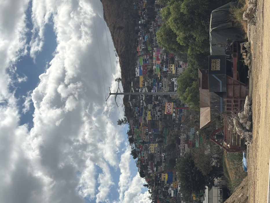 A hillside town with colorful homes is viewed on a partly cloudy day. A utility pole runs vertically along the frame. A red and white OXXO sign stands out among the houses. In the foreground, there is a construction site with a large black and silver machine labeled "EXCESO DE DIMENSIONES." Debris and a truck are partially visible. The sky is filled with large, fluffy clouds.