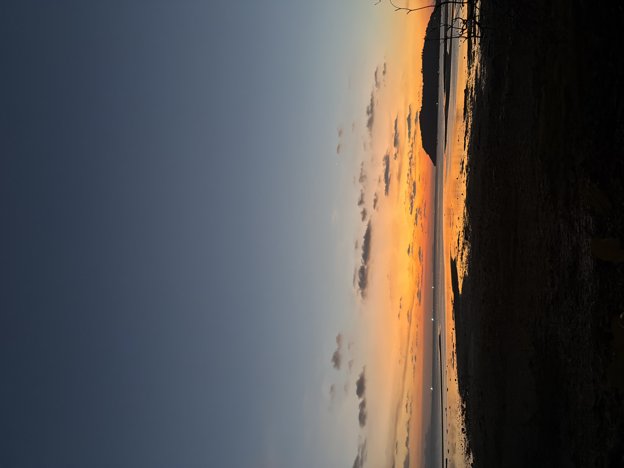 The image displays a coastal landscape at sunset in Baan Thong Krut, Thailand. The sky presents a gradient from deep blue at the zenith to intense orange and yellow at the horizon. Scattered dark gray clouds are present within the brighter sky band. A single luminous point, consistent with a star or planet, is observed in the upper-middle left sky. The foreground consists of dark, uneven terrain, indicative of exposed tidal flats or a beach. A body of water occupies the middle ground, reflecting the strong orange light from the setting sun. Multiple faint white lights are discernible on the distant water surface. A prominent, dark, silhouetted landmass, appearing as an island or peninsula, rises from the water on the right side of the frame, exhibiting an irregular profile. Bare tree branches are partially silhouetted on the extreme right edge of the foreground. No individuals, discernible structures beyond distant lights, or active subjects are present.