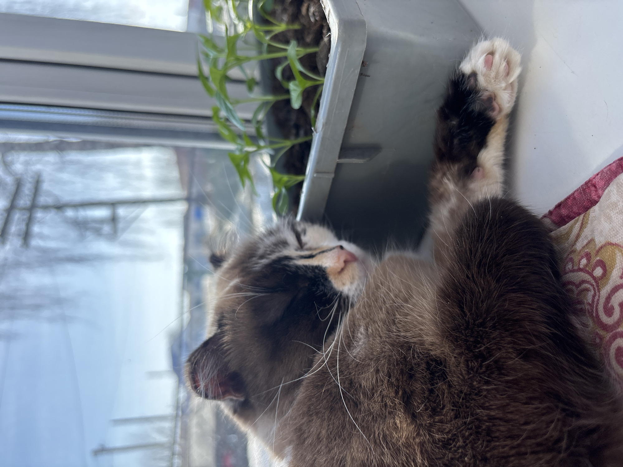 A domestic cat lies asleep on a patterned cushion next to a window in what appears to be an indoor environment. The cat has brown and white fur and a light-pink nose. Its paws are white with black patches, and one paw is extended onto the windowsill. Next to the cat is a small trough-style container filled with green sprouts, likely herbs or other plants, on the windowsill. The window is visible with an overcast sky reflecting off of it. There is no indication that this photo was taken in the city of Osa, Russia.