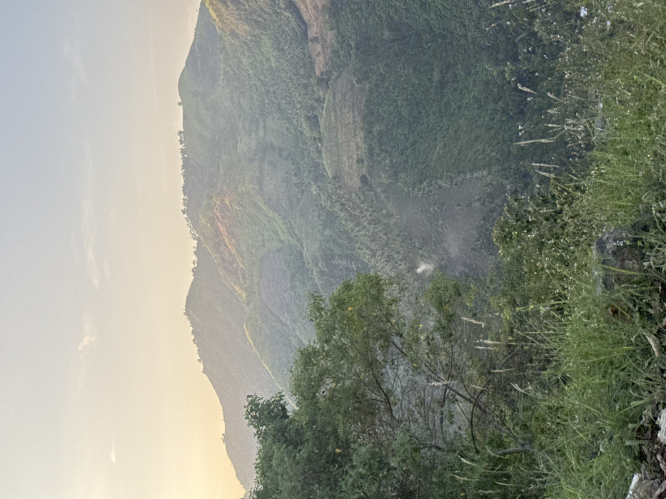 The image presents a wide view of a mountainous landscape located in Lutayan, Philippines, under conditions of soft, diffused light, possibly during sunrise or sunset. The sky occupies the upper portion, displaying a gradient from a warm yellow-orange hue on the left to a pale blue-grey on the right, with sparse, wispy clouds. Multiple layers of green hills and mountains extend into the background, progressively fading in color and sharpness due to atmospheric perspective. The foreground is dominated by dark green foliage, including the branches and leaves of a substantial tree on the left side, and a dense ground cover of tall green grasses and various low-lying plants, some with seed heads, at the bottom. Scattered rocks or small boulders are partially visible within the immediate foreground vegetation. The mid-ground mountain slopes are heavily vegetated, primarily with dense green trees and shrubs. Several areas on these slopes exhibit variations in cover, with some sections appearing as lighter, possibly cleared or terraced patches, indicative of agricultural activity or deforestation. A distinct, roughly oval-shaped area of lighter vegetation is visible on one of the central slopes. A small, irregular white plume, consistent with smoke or localized mist, is visible emanating from a lower, densely vegetated section of a valley in the mid-left portion of the scene. No individuals, animals, or overt man-made structures are identifiable within the frame.