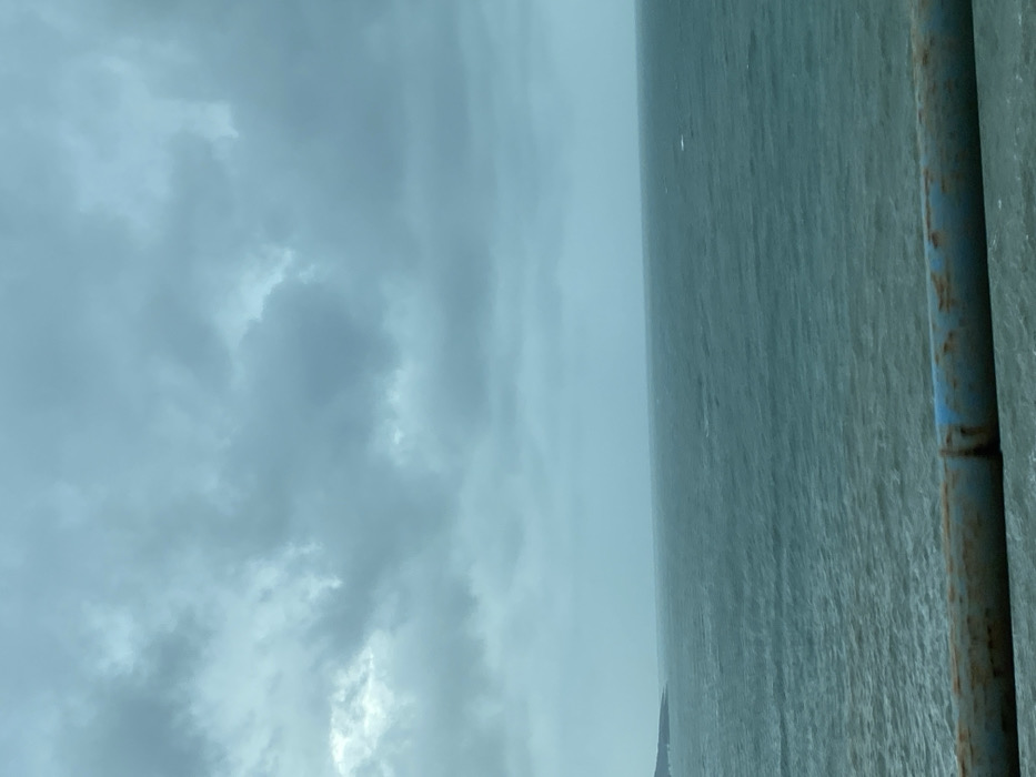 The image depicts a panoramic view of the sea under an overcast sky, observed from an elevated coastal position in Dobra Voda, Montenegro. The sky, occupying the upper two-thirds of the frame, is entirely covered by dense, dark grey stratocumulus clouds, indicating heavily cloudy weather. The sea, likely the Adriatic Sea, fills the middle ground, presenting a choppy surface with visible waves in shades of dark teal-grey, suggesting active water conditions. A faint, dark landmass, representing a coastline or headland of Dobra Voda, is visible stretching from the far left into the distance. In the immediate foreground, a weathered metal pipe or railing, heavily rusted with discernible patches of faded blue paint, extends horizontally across the bottom of the frame, acting as a barrier. No individuals or specific actions are present in the scene.