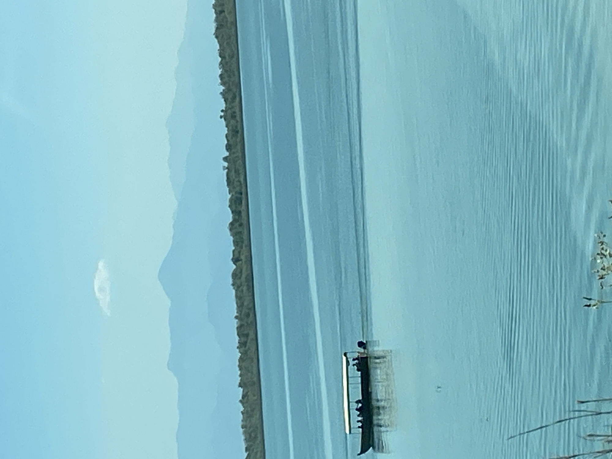 A horizontally oriented landscape image shows a long, narrow boat on a body of water
