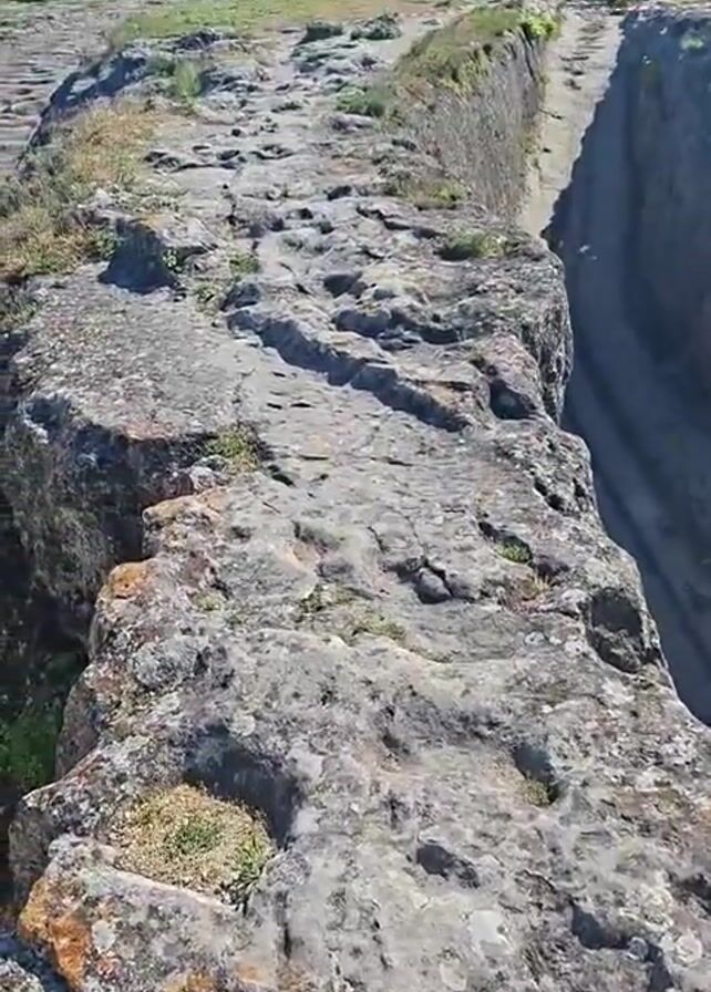 The camera pans up from a weathered stone path, revealing a deep, narrow trench cut into the rock