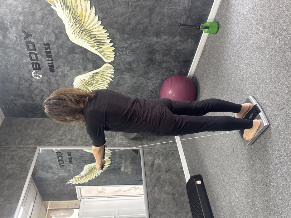 The image displays an interior scene within a wellness center, identified by "BODY WELLNESS" signage, located in Sofia, Bulgaria. A single individual, viewed from the back, stands barefoot on a silver and black body composition scale positioned centrally on a grey speckled floor. The person wears a black long-sleeved shirt and black trousers; their medium-brown hair is disheveled. Both arms are extended forward at approximately shoulder height, holding a thin white cable or strap. The walls are dark grey with a textured finish, featuring white skirting boards along the bottom. On the back wall, the words "BODY WELLNESS" are affixed in black three-dimensional letters, flanked by large, stylized white and gold angel wings. To the left, a large rectangular mirror with a silver frame reflects a white door and the inverted "BODY WELLNESS" signage. Various fitness equipment is present: a black exercise step platform with orange accents rests on the floor to the left, a large purple exercise ball is situated against the right wall, and a green kettlebell-shaped object with a black handle is on the floor in the far right corner. Overhead lighting fixtures are visible at the top of the frame.