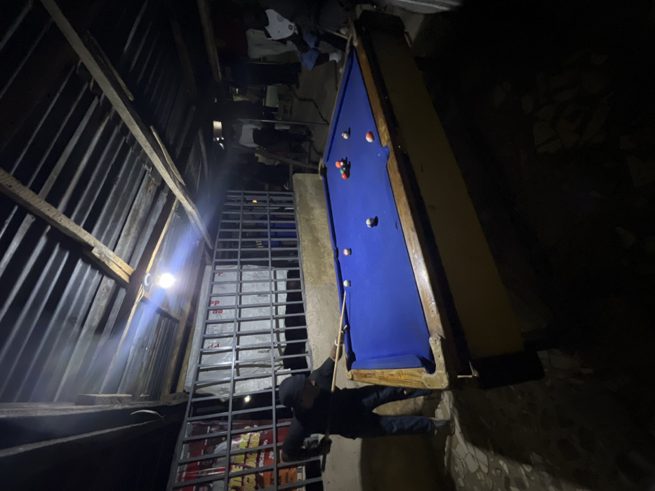 - "Under a low corrugated metal roof, a dimly lit room houses a blue pool table with several balls arranged on it" by FM-pgYUG2, licensed under CC BY 4.0