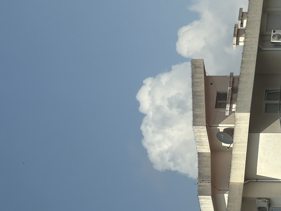 This image presents an elevated view of the upper portions of a multi-story structure within the city of Bar, Montenegro. The sky is clear blue, occupied by two prominent white cumulus cloud formations; a larger, billowy cloud is centered above the building, with a smaller, more distant cloud visible to its right. A minute, dark, indistinct object, consistent with a bird or insect, is observed in the upper-left quadrant of the sky. The building's visible elements consist of light-toned, likely pale beige, facades and flat concrete roof structures. These concrete surfaces exhibit varying degrees of weathering, marked by dark streaks and general discoloration. Key features include a black, circular satellite dish mounted on an exterior wall, multiple recessed windows, some fitted with horizontal louvered shutters, and several external air conditioning condenser units attached to the lower visible sections. Vertical piping, consistent with drainage or utility conduits, is present on the building's exterior. The roofline is equipped with multiple small, dark, pointed protrusions, likely lightning arrestors or antenna elements, and two distinct, short, rectangular structures resembling vents or chimney flues positioned on the right side. No human presence, direct actions, or interactions are discernible. The scene is illuminated by direct daylight, producing defined shadows.