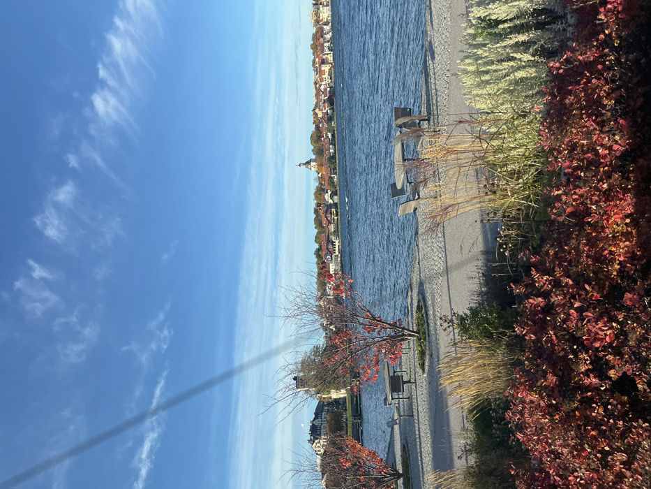 The image depicts a waterfront scene in Västervik, Sweden, observed from a paved promenade looking across a body of water towards the city's main developed area. The sky is bright blue with scattered white, wispy clouds. A prominent dark diagonal line artifact extends from the upper left corner towards the mid-right. In the mid-ground, a wide expanse of blue water with visible ripples separates the foreground from the distant cityscape. Across the water, the city of Västervik features numerous buildings with red-tiled roofs, intermingled with deciduous trees displaying various autumn colors (red, orange, yellow). A prominent landmark, Västerviks kyrka (Västervik Church), with its light-colored tower topped by a dark, rounded dome, rises above the other structures slightly to the right of center. Along the immediate waterfront in the mid-ground, a light-colored paved walkway, possibly cobblestone, is visible. Several outdoor seating areas are arranged on this pavement, including at least two round tables, each accompanied by two or three light-toned wooden benches facing the water. Small, slender deciduous trees with vibrant red autumn leaves are planted in circular beds along the promenade. The foreground of the image is dominated by lush ornamental vegetation. This includes dense, low-lying shrubs with deep red and orange autumn foliage, taller golden-brown ornamental grasses, and other perennials with light green or silvery-white foliage. No individuals or specific human actions are visible in the scene. The overall lighting is bright and sunny, indicating clear weather. The vibrant foliage confirms an autumn season setting.