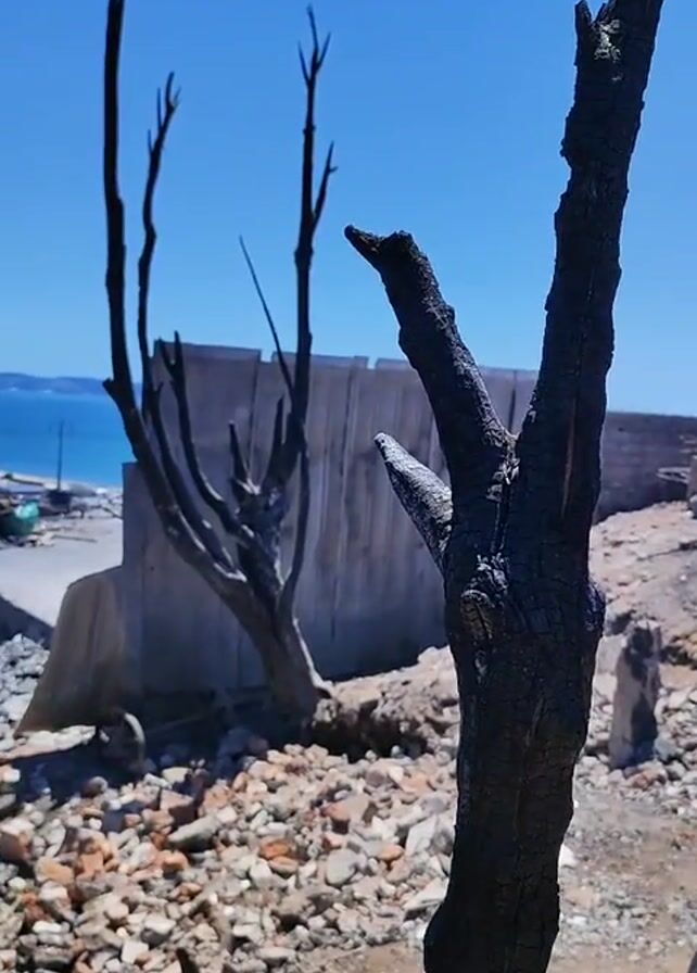 aftermath of a fire. The scene consists of a landscape of rubble and debris, likely the remains of a building. There are two charred trees in the foreground. The sky is blue. The background shows a coastal town with a body of water visible in the distance. A person wearing a blue shirt and a black baseball cap is partially visible in the lower right corner of the frame. The camera pans slightly to reveal more of the landscape.