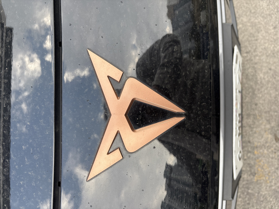A close-up photograph reveals a bronze-colored emblem on a black vehicle