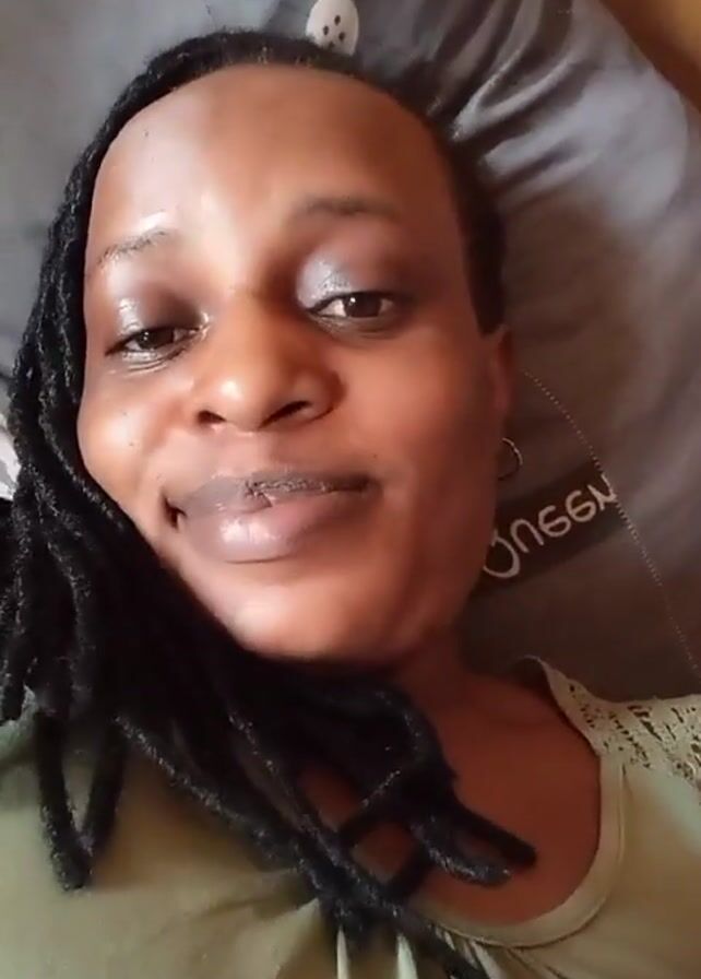 A close-up shot shows a person with brown skin, black dreadlocks, and wearing an olive green top, lying on a gray pillow