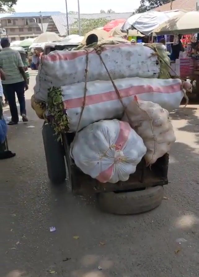 The video depicts a busy outdoor market scene. The main focus is a three-wheeled cart overloaded with large sacks, secured with ropes. The cart is stationary on an asphalt road. A man in a striped shirt walks into the frame, obscuring the cart momentarily. People are milling around, some browsing the market stalls. The environment includes trees, stalls with umbrellas, and buildings in the background. The lighting is bright and sunny.
