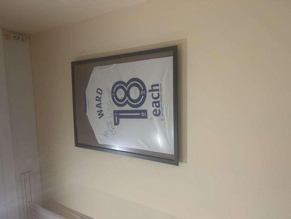 This image captures a framed white sports jersey mounted on a plain, light beige wall in an indoor location in Graf Ignatievo, Bulgaria. The jersey features the name "WARD" printed in blue capital letters across the upper back, with the number "18" in blue below it. The numbers are composed of small, stylized figures. Below the number, the "EFL" logo is visible, followed by the "each" logo and the full text "East Anglia's Children's Hospices". Handwritten inscriptions in black ink are present on the jersey; one inscription on the left reads, "To [unclear name], Best Wishes and luck in your career!", accompanied by a signature. Another signature is visible to the right of the number "18". The jersey is housed within a dark-colored, rectangular frame, likely black. The wall extends upwards to a white ceiling, where a linear light fixture or curtain rod is partially visible in the upper left quadrant, and a small electrical component is visible in the upper right corner where the wall meets the ceiling.