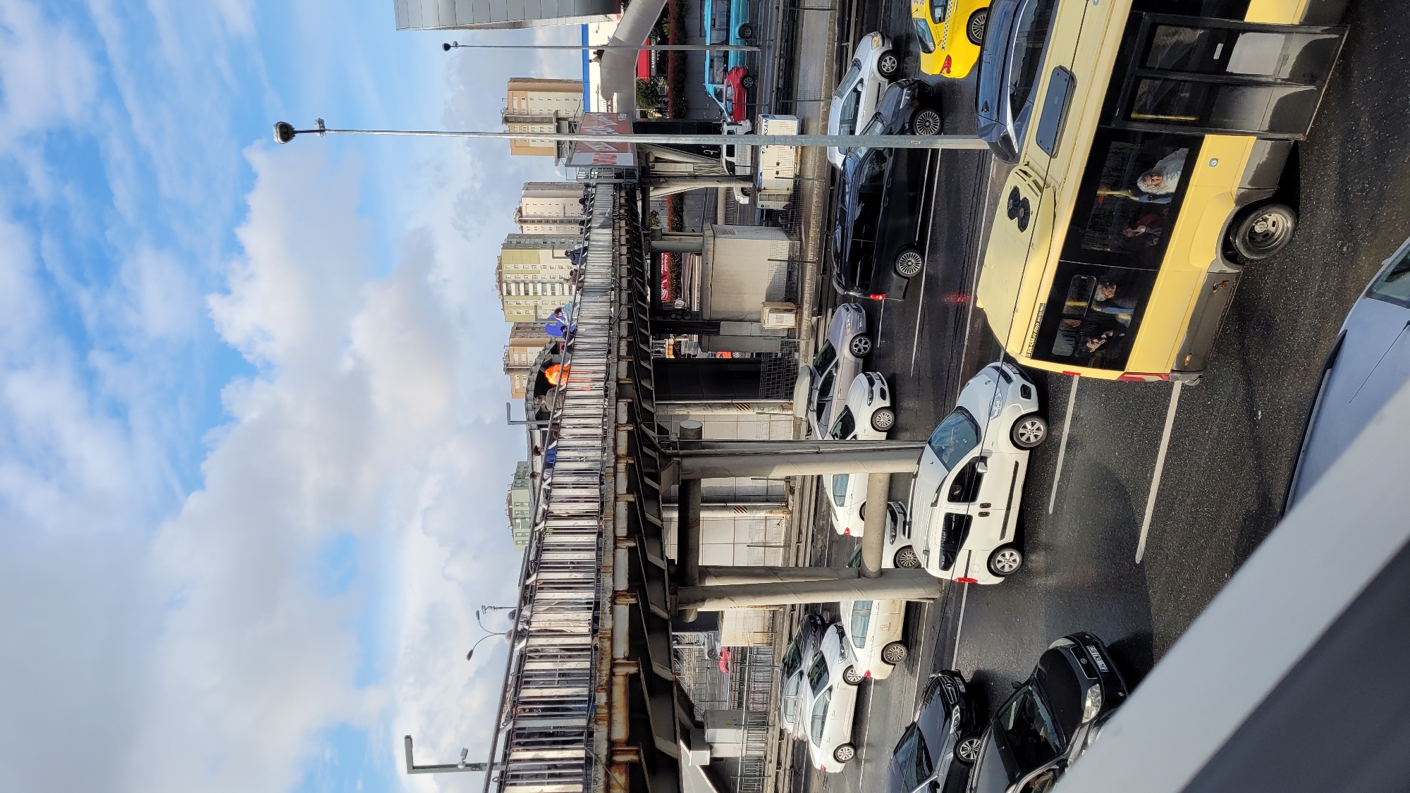 The image presents an elevated perspective of a street scene in Beylikdüzü, Turkey. The primary focus is a bustling roadway filled with vehicles, including cars, a yellow minibus carrying passengers, and what appear to be taxis. The street surface shows signs of recent rain. An elevated metal pedestrian bridge spans the roadway, with individuals visible on the structure. High-rise buildings form a backdrop to the scene, situated behind the pedestrian bridge. The sky is partly cloudy with blue patches visible. Lampposts are erected along the sides of the pedestrian bridge.