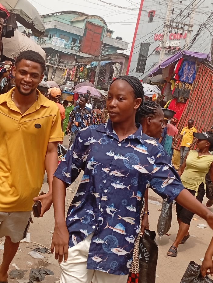 Two young adults, a man in a yellow polo and white shorts and a woman in a blue fish-printed shirt and white pants, are walking through a crowded outdoor market. The market is bustling with activity, with stalls selling clothes and other goods. Overhead, power lines are visible. Other people can be seen around them, some carrying umbrellas to shield from the sun.