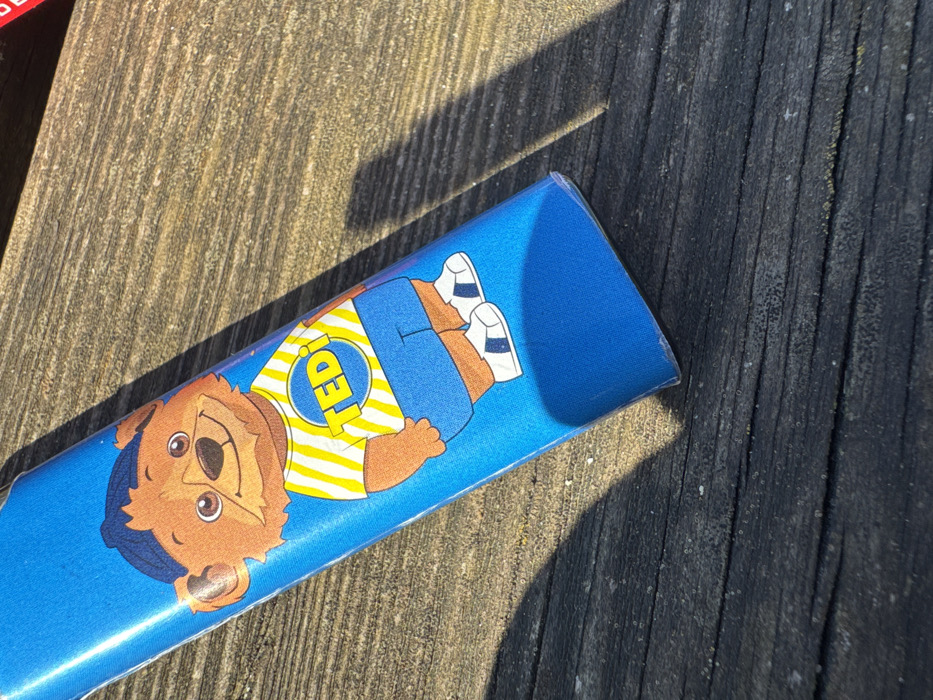 The image displays a blue, rectangular object, likely packaging, resting diagonally on a weathered wooden surface in Venlo, Netherlands. The object's visible side features a cartoon illustration of a smiling brown bear character. The bear wears a blue baseball cap, a yellow and white striped t-shirt with a blue circular emblem containing the yellow text "TED," blue shorts, and white sneakers with blue details. The object casts a sharp, dark shadow onto the wooden planks, indicating direct illumination from a strong light source. The background consists of multiple horizontal wooden planks exhibiting prominent grain and signs of weathering. A small segment of a red object is partially visible in the upper right corner of the frame. No human subjects are present.