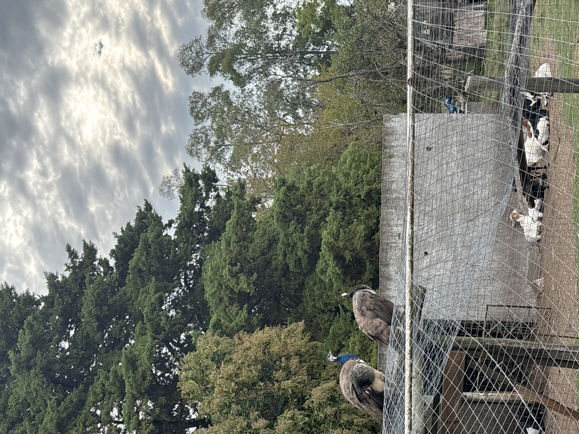 This image captures an outdoor animal enclosure scene in Nueva Helvecia, Uruguay, under a cloudy sky. Two peafowl, likely peahens given their subdued plumage, are perched on the wire mesh roof of a large animal enclosure. The peafowl on the left exhibits a blue-green neck and faces partially left, while the peafowl on the right faces away from the camera, showing a dark head and neck. Both have brown and beige body feathers. Below them, within the enclosure, several goats are visible resting on a dirt ground. At least four goats are clustered towards the center-right, one white with brown patches, one predominantly white, and one black and white, all in recumbent positions. The enclosure is constructed with wire mesh fencing and appears to have a wooden support framework. A rough, light grey concrete wall forms the background for the enclosure. Behind the wall and enclosure, a dense array of trees fills the upper portion of the image. On the far left, dark green coniferous trees are prominent, while towards the center and right, deciduous trees with lighter green and sparser foliage are visible. A shrubby tree with light green-brown foliage and visible clusters of small structures (possibly berries or flowers) is present behind the peafowl on the left. The sky overhead is overcast with textured grey clouds, revealing brighter patches of diffused sunlight, and a small, dark, undefined shape is noted in the upper right quadrant of the sky.