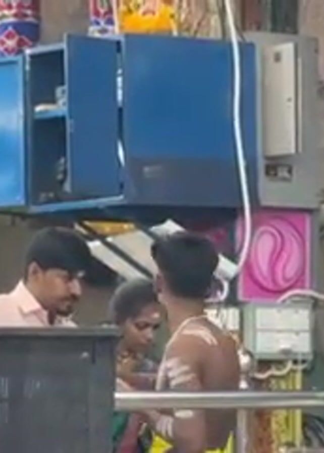 people inside a Hindu temple. There are men and women present, with some men wearing traditional clothing and shaved torsos. A blue cabinet is visible behind them. Statues and decorative elements can be seen, along with electrical wiring. The people are engaged in various activities, including prayer. The environment appears to be a bustling, religious setting.