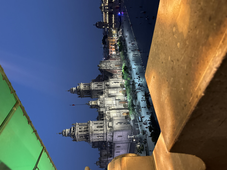 A night view shows a grand, ornate cathedral with multiple towers, illuminated against a deep blue sky. A plaza teeming with people lies in front of the cathedral, lights reflecting on its surface. A weathered, stone ledge occupies the foreground on the right, and a green structure appears on the left. Other buildings stretch in the distance. The cathedral is highly detailed, displaying intricate architectural features and a sense of historical grandeur.