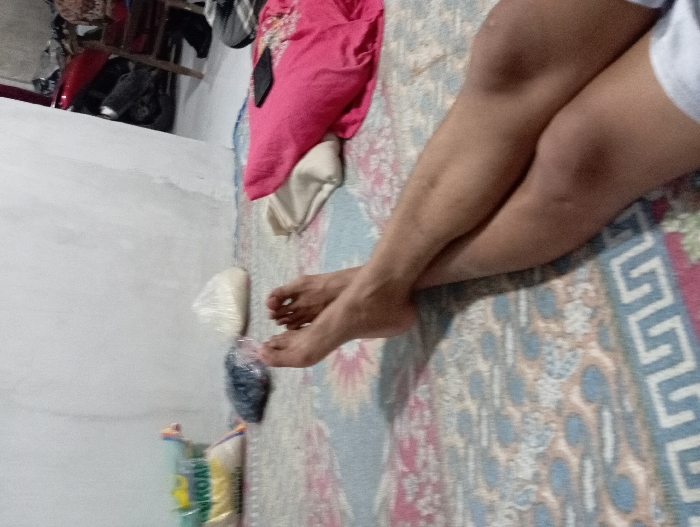 The image depicts an indoor scene in Bulukandang, Indonesia. The foreground is dominated by the lower legs and bare feet of an individual, positioned with ankles crossed, resting on a patterned floor rug. The individual wears white shorts, partially visible at the bottom right. The rug features a repeating geometric design in shades of blue, white, pink, and beige. In the mid-ground on the rug, from left to right, are a large white sack with green and yellow markings (partially labeled "KOAM"), a dark-colored bag wrapped in clear plastic, and a clear plastic bag containing white granular material. To the right, on the rug, a bright pink cushion or folded fabric item is present, with a dark-colored smartphone resting on its surface. Beneath or beside the pink item is a folded light-colored, possibly beige, fabric item. The background consists of a plain, light-colored wall. In the upper right quadrant, a red motorcycle and a portion of a wooden chair are visible on a lighter floor surface beyond the rug.
