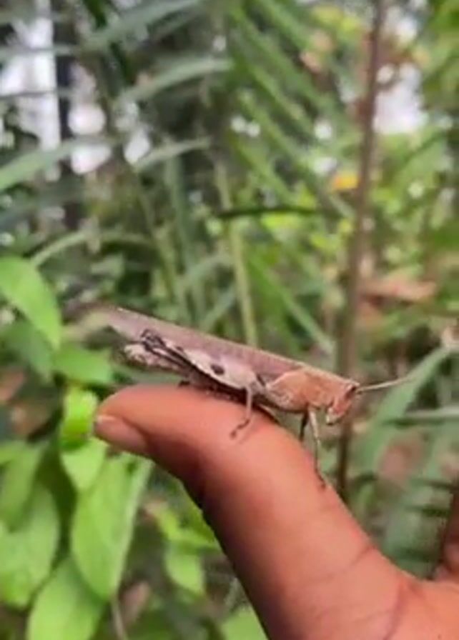 A close-up shot shows a brown grasshopper perched on the fingertip of a dark-skinned hand