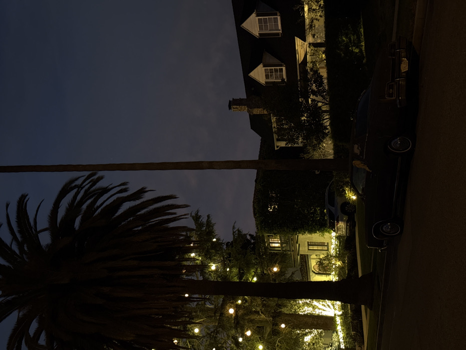 A nighttime scene features a dark palm tree in the foreground, partially obscuring a street. Christmas lights adorn trees along the avenue. Upscale houses are visible behind the trees, with one grand house showcasing lit windows and visible dormers. Parked cars line the right side of the street, adding to the ambiance of a well-to-do residential area. The sky is dark, hinting at dusk or night.