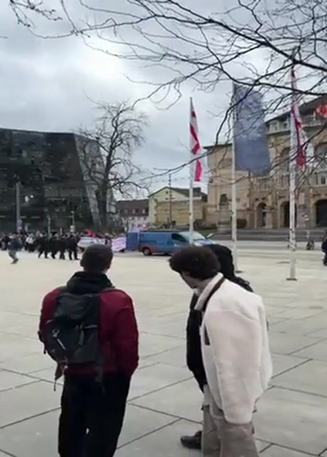 public square in an urban area with a demonstration or protest taking place. There are buildings in the background, including one modern glass building. Flags are visible in front of one of the more traditional buildings. People are gathered and marching, carrying a banner. A line of police officers in black uniforms is marching alongside the group of people. A few individuals stand in the foreground observing the scene. Blue vans, likely police vehicles, are parked nearby. The weather appears overcast, and trees surrounding the area are mostly bare.