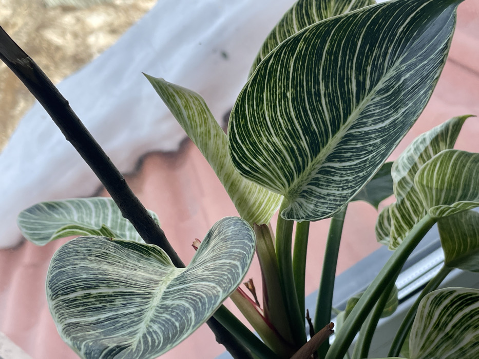 - "The scene, located in Ново-Никольское, Russia, presents a close-up, high-angle view of a variegated houseplant, consistent with a Philodendron 'Birkin'" by FM-vGaxl2, licensed under CC BY 4.0